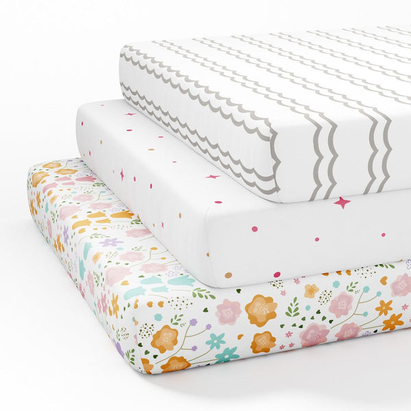 3 Piece Bouquet of Flowers, Rippled and Star of Bethlehem Elastic Crib Sheet Set