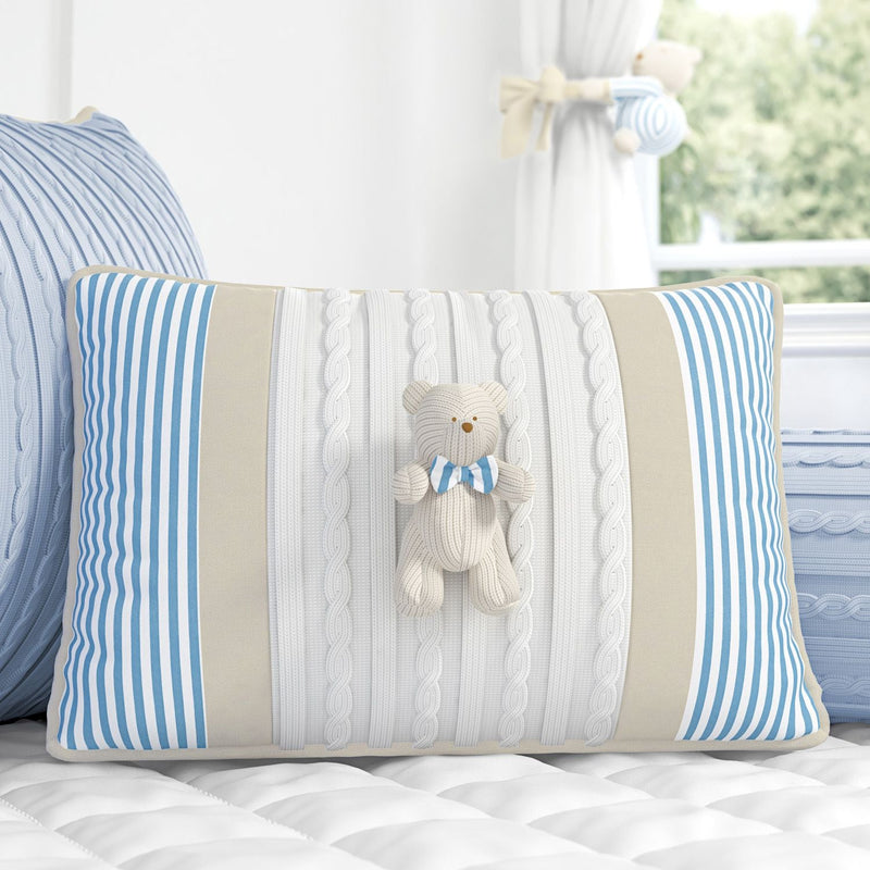 The applied bear brings a lot of cuteness, and the knitting and the cotton fabric are sure to make your baby's room cozy! These are some of the characteristics of the Blue and Beige Luxury Teddy Bear Knitted Rectangular Cushion 17". The fluffy filling and the blue, sand, and white colors stand out in the most special corner of the house!
