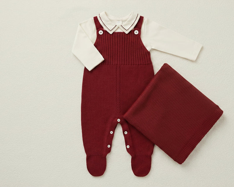 Crafted in a soft 100% acrylic knit, the set includes a footed knit romper with a classic layered-look design and a matching knit blanket, creating a cohesive and sophisticated ensemble. The rich burgundy tone adds depth and warmth, making this set especially memorable for a baby’s first outing or as a meaningful gift.